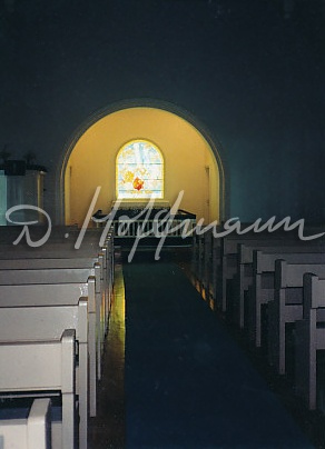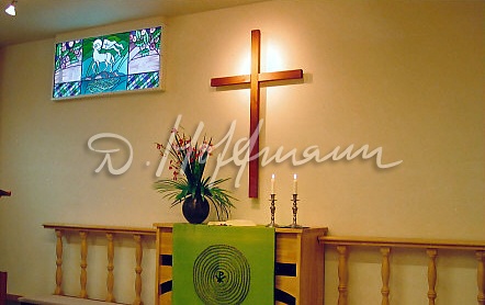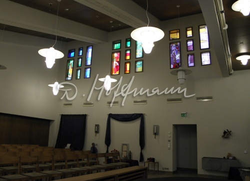 Алтарное окно "Святая вечеря" в церкви Хеймталь (фото: Аво Веске)На молитву Таллиннской Ныммеской баптистской церкви (Фото со страницы: www.nbk.ee)Розовое окно в часовне Ныммеской баптистской церквиОкна в молитвенном доме Ныммеской баптистской церкви (Фото с сайта www.nbk.ee)Внутренний вид Нарвской Александровской лютеранской церкви